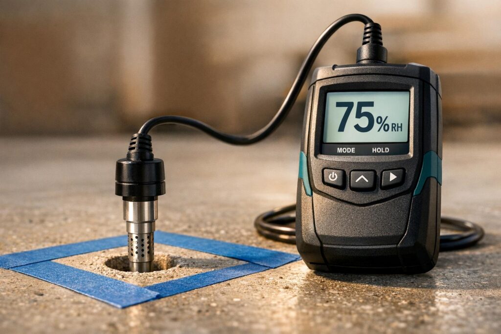 However, RH probes dig deeper – literally. They measure the moisture vapor trapped within the slab’s interior. Even if the surface seems dry, the internal moisture levels could be high enough to cause issues with coatings, adhesives, or finishes. It’s a reminder that relying solely on surface tests can be misleading when evaluating a slab’s readiness for flooring or other applications.