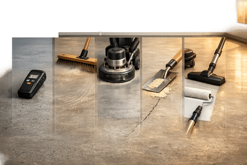 - Assess the Concrete Surface: Check for moisture, cracks, and weak spots. Use tests like the plastic sheet test or calcium chloride test to identify hidden moisture issues.