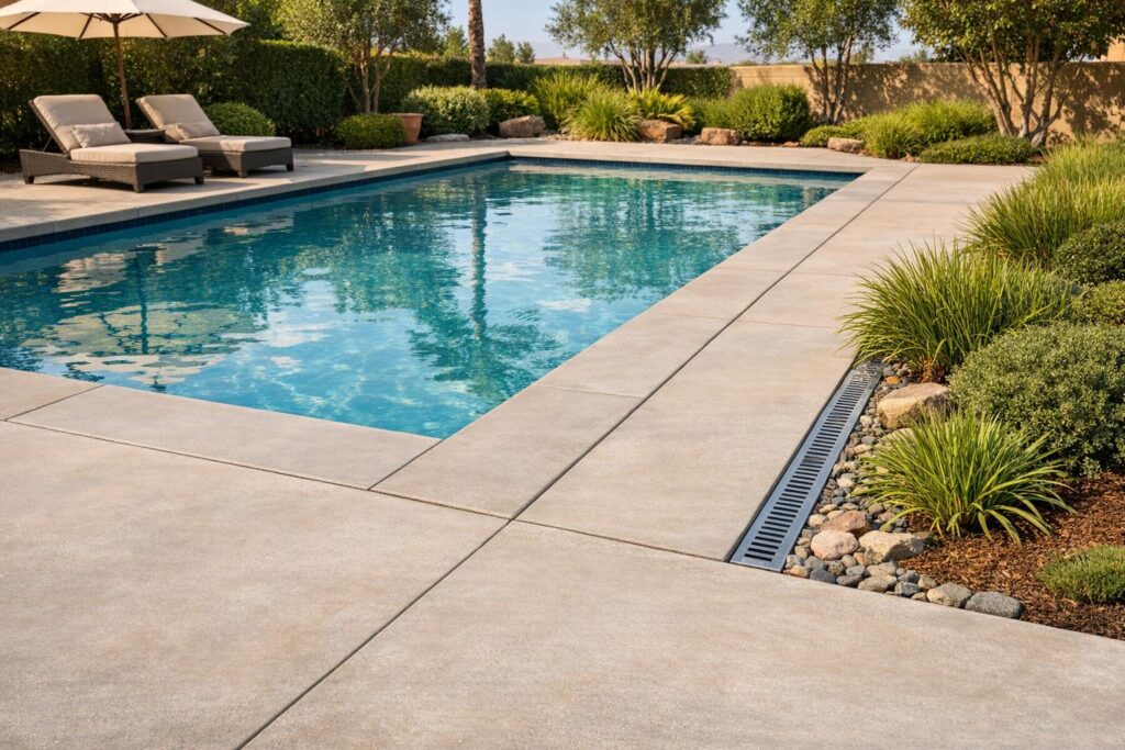 Proper drainage plays a crucial role in keeping your pool deck crack-free. To start, ensure the deck has the correct slope – roughly 1–2% (or about 1/4 to 1/2 inch per foot) – to channel water away from the pool. If the deck is too flat or has areas where water collects, a professional can either re-grade the surface or apply an overlay to fix the slope. Additionally, installing or maintaining drainage systems like French drains or weep holes can help eliminate standing water, which can lead to soil pressure and eventually damage the concrete.